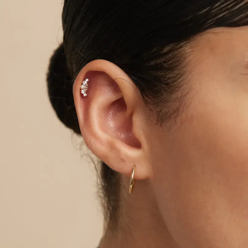 Een tragus piercing is een type kraakbeenpiercing en valt onder de oorpiercings. Een traguspiercing wordt gezet door het kleine flapje kraakbeen aan de voorkant van je oor, net voor je gehoorgang. Hierdoor zit het piercingsieraad net tegen de zijkant van je gezicht aan, wat veel mensen een mooie en subtiele plek vinden. Meestal wordt er een klein sieraadje in deze piercing gedragen,