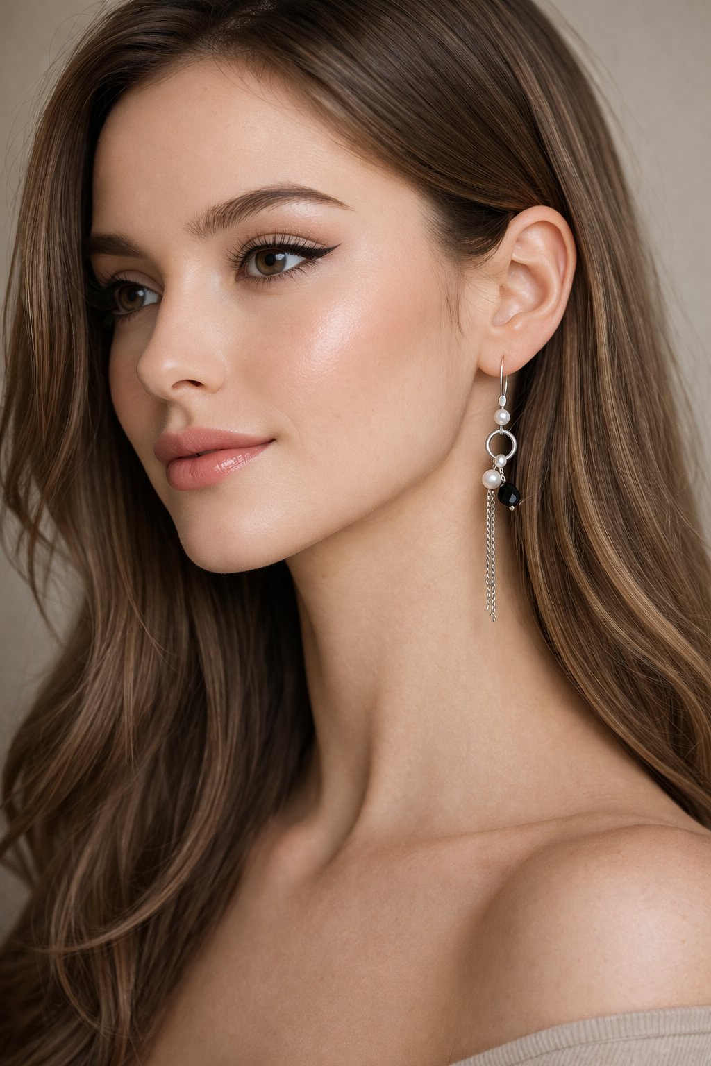 These earrings feature a delicate interplay of shimmering white pearls and a bold black onyx-style bead, suspended from an elegant silver ring. The cascading silver chainsadd a touch of fluid movement and modern sophistication, catching the light with every turn of your head.