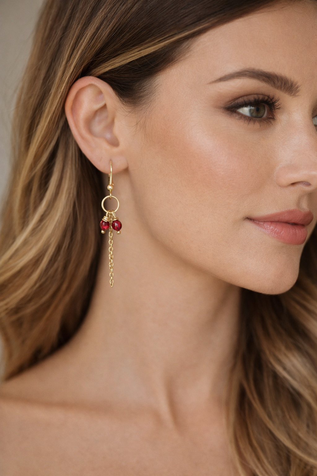 Expertly handcrafted from premium 925 Sterling Silver and finished with a rich 18K gold plating, these earrings offer the perfect balance of luxury and durability. The design features a dainty gold hoop adorned with two vivid, ruby-red beads that provide a striking contrast against the gold. A single, slender chain drops elegantly from the center, creating a graceful silhouette that moves with you.
